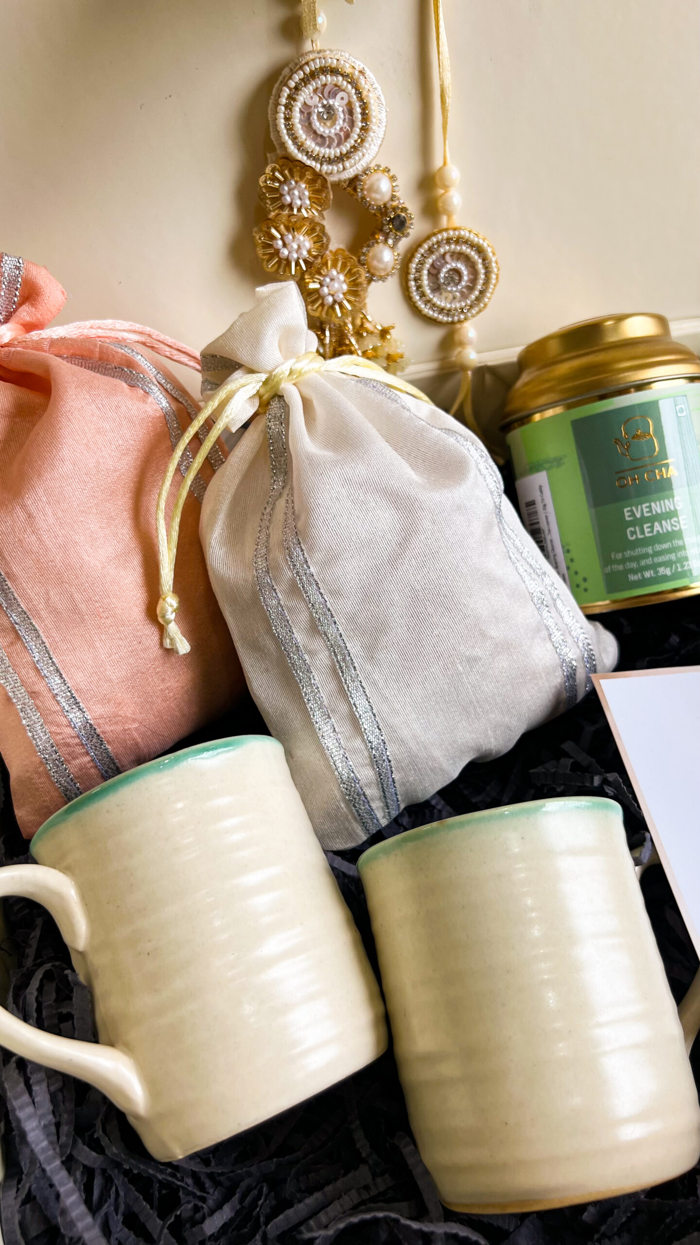 Festive Beige box with gold ribbon packaging in size 12x10x3.5 inches.