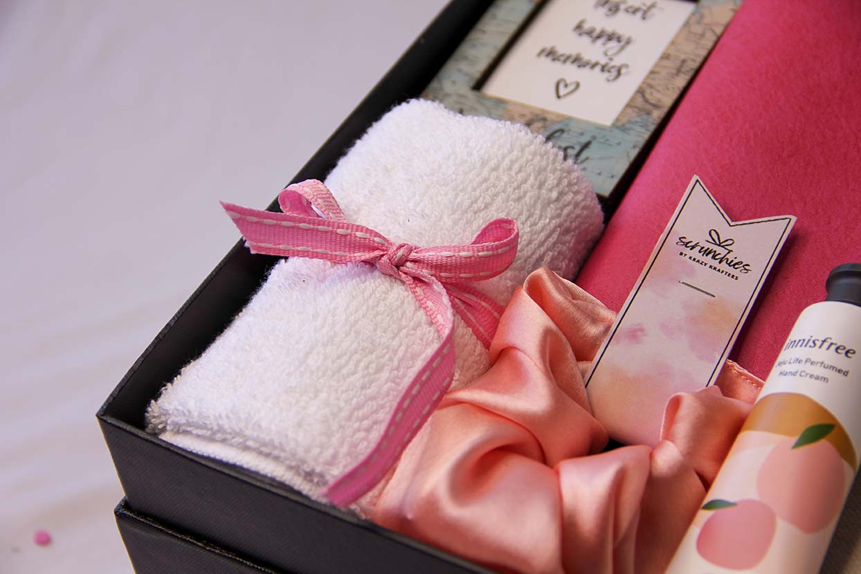 Our signature classic black box is 9 x 9 x 4.5 inches. It is sturdy and elegant with quality finish. It is reusable and a keepsake in itself!