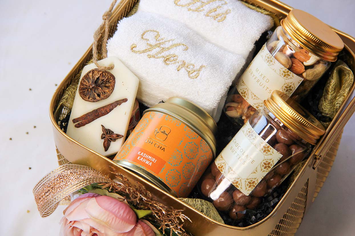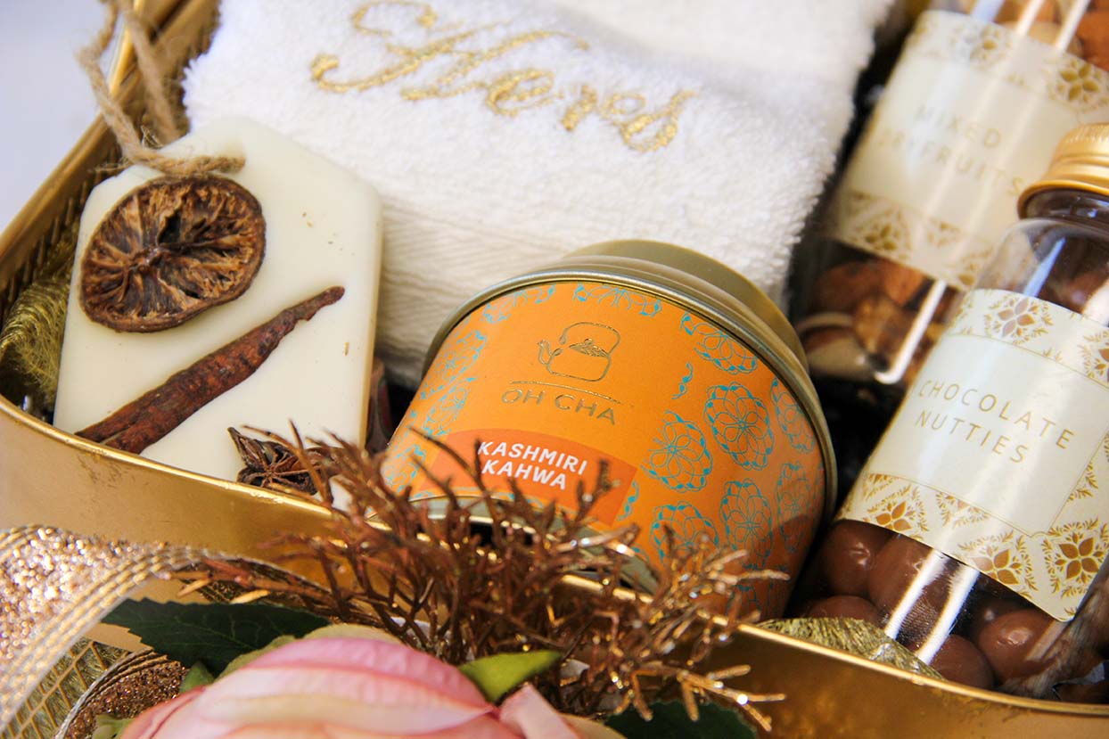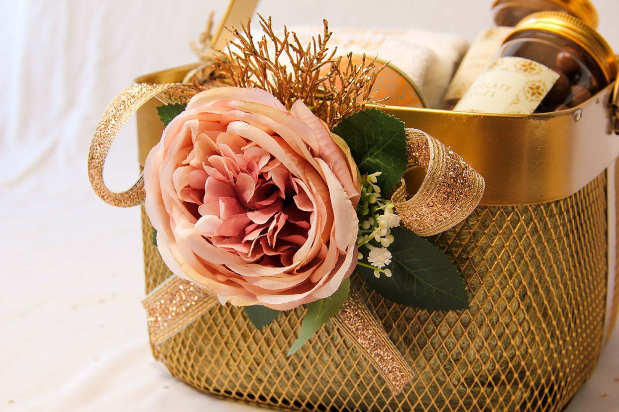 The dimension of the golden mesh basket is 8 x 8 x 6 inches. It is sturdy and elegant with quality finish. It is reusable and a keepsake in itself!